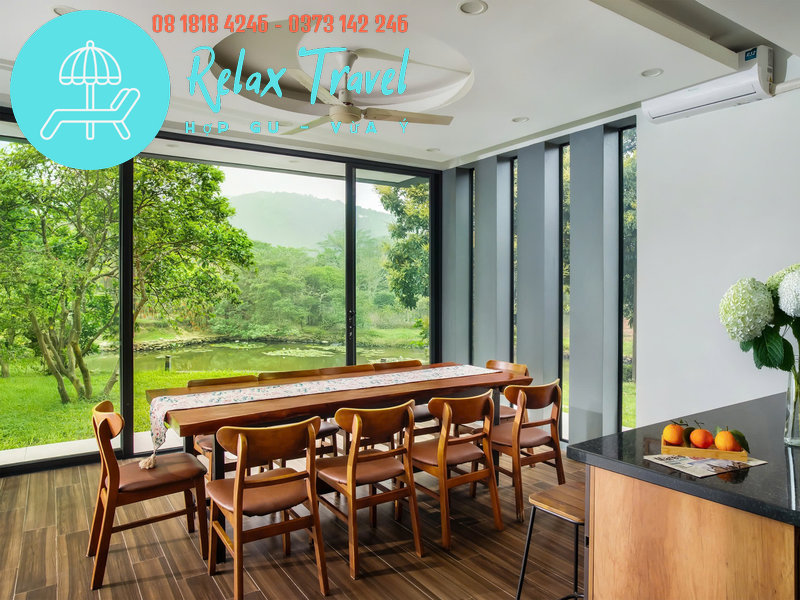 Có khu nướng BBQ, bếp rộng, khu vực ăn uống view hồ và sân vườn.