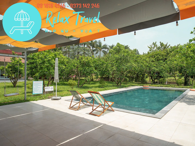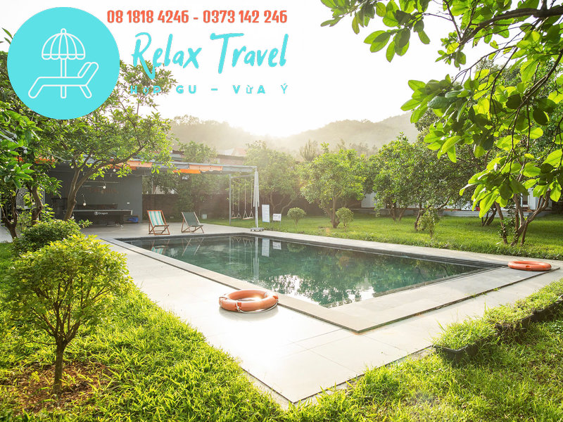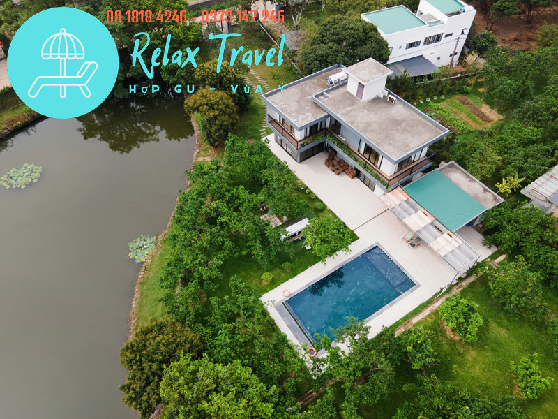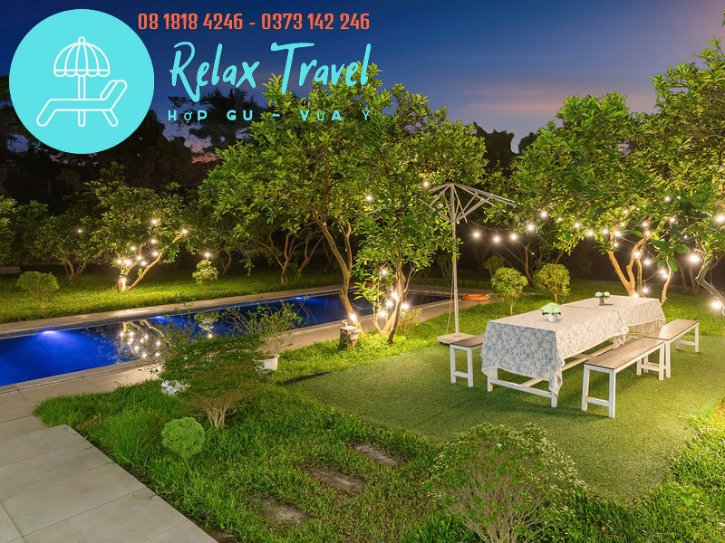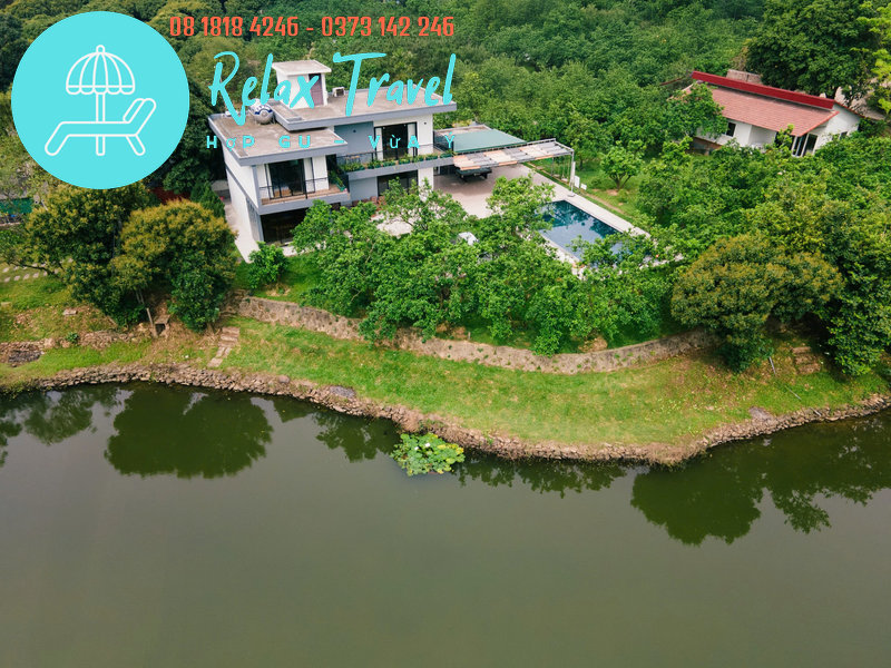 Có bể bơi riêng, bàn ăn ngoài vườn, view toàn cảnh hồ – bể bơi – sân vườn.