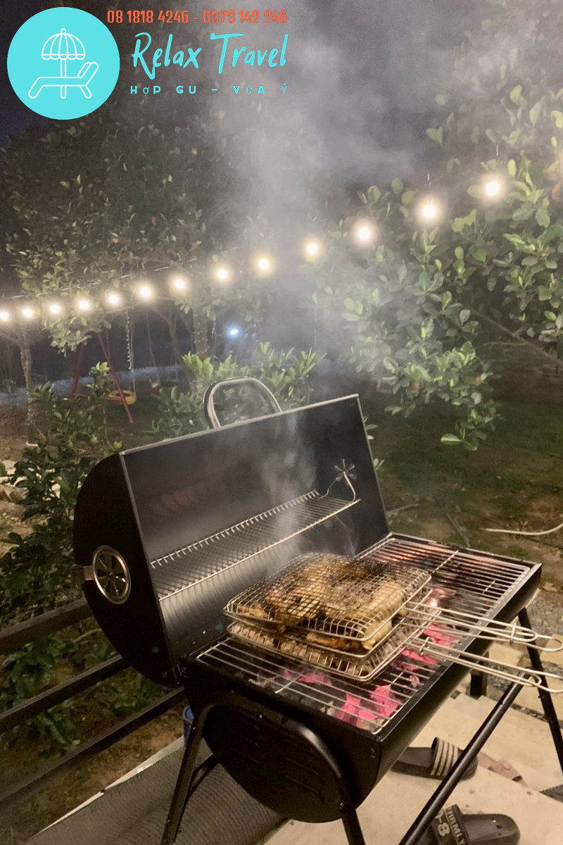 🍽️ Bếp riêng biệt view vườn – đầy đủ nồi niêu, bếp nướng BBQ